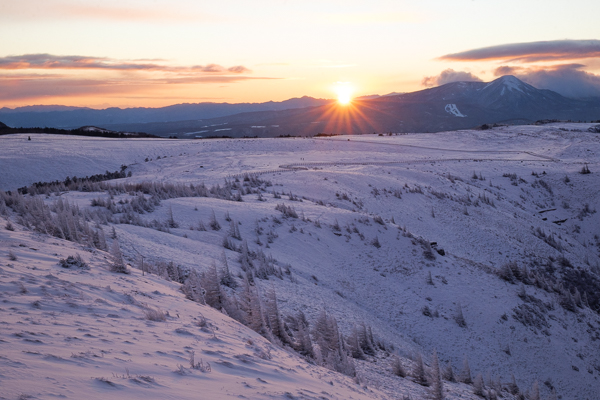朝の気温:-8℃ 昼の気温:-2℃ 朝焼けです。穏やかで暖かい一日、終日360度の山岳展望を楽しむことができました。 牧場から王ヶ頭を望む。今日は「NHKにっぽん百名山冬特集」の取材にきていただいています。最高の撮影日和となりました。放送日は3月2日です。ぜひご覧ください。