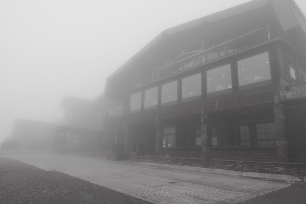 同じ時、電波塔と高原の緑。雲に由来する霧の中へと消えてゆきます。