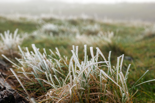 高原には霜が降り、草原の草にはガラス細工のような氷の結晶がついていました。