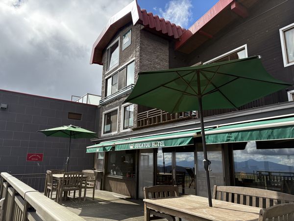 日中のホテル正面玄関付近。日の入り時間が早くなっているため、テラスのパラソルを出せる時間も少なくなってきました。