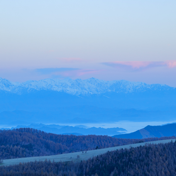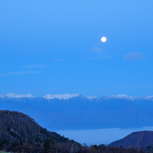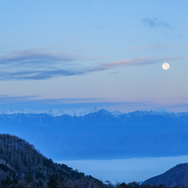 日の出前の静かな青の世界に、煌々と輝くお月様、冠雪の北アルプス、雲海。