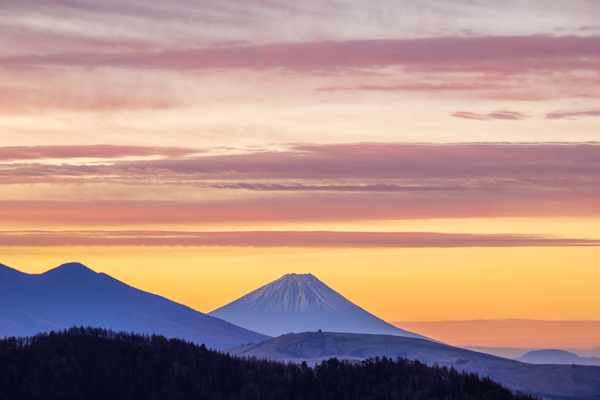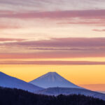 写真ほぼ中心が富士山、富士山を中心に右が南アルプス、左が八ヶ岳。
