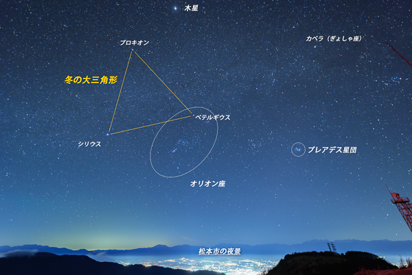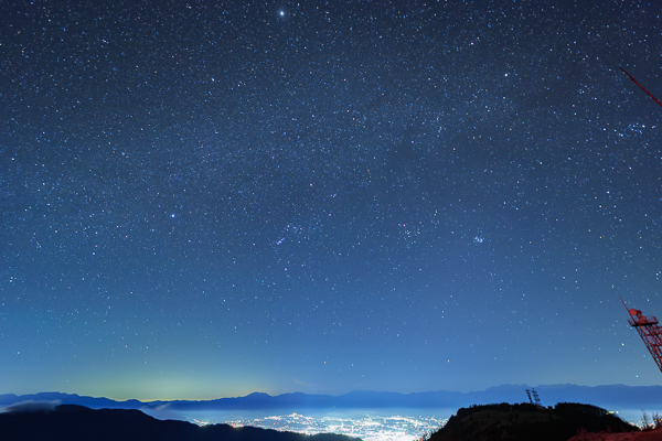 夜明け前の星空~松本市の夜景と冬の星座