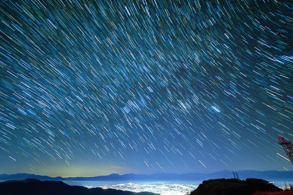 4時29分、王ヶ頭山頂から眺めた松本市の夜景と西の空。