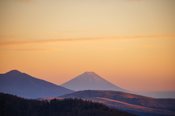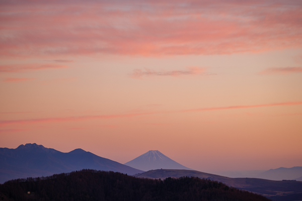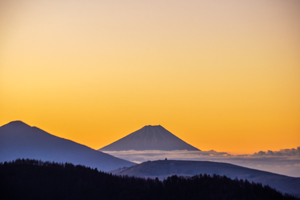 6時11分、日の出を待つ展望テラスで、朝焼けの富士山。