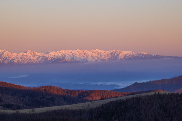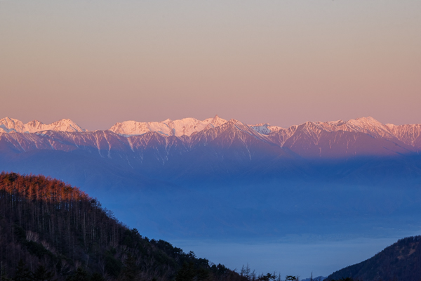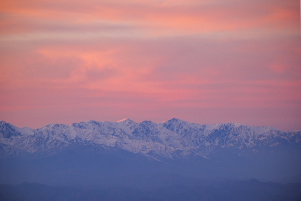 6時32分、走って移動して、北側の広場から撮影した北アルプスのモルゲンロート。