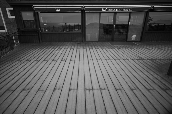 うっすらと霜が付いた展望テラスのデッキ。
