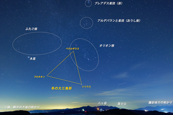 ホテル前の東の空には冬の星座が勢ぞろい。しんがりのシリウスも昇り、冬の大三角形も描けます。