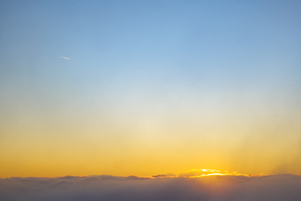 16時31分、日没後の穏やかな夕暮れの空に、飛んで行く飛行機が雲を引いていました。