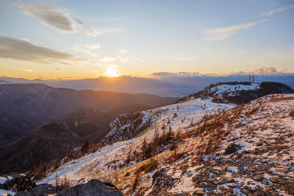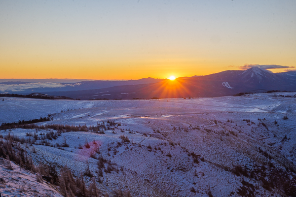6時54分、美ヶ原の雪原の向こう、雲一つない稜線から朝日が昇りました。