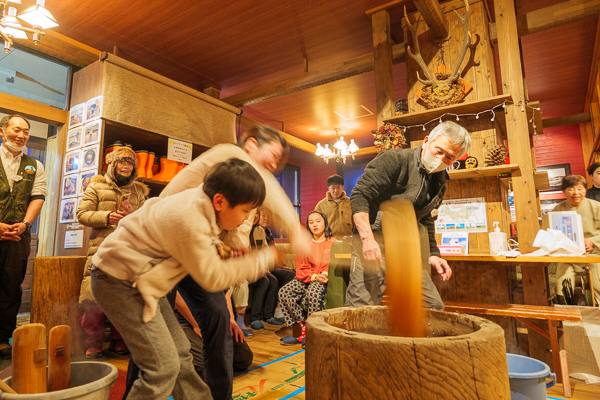 大人も子供も、力を合わせてついたお餅は、今夜のお夜食としてふるまわれます。
