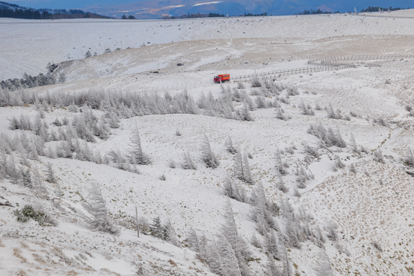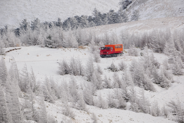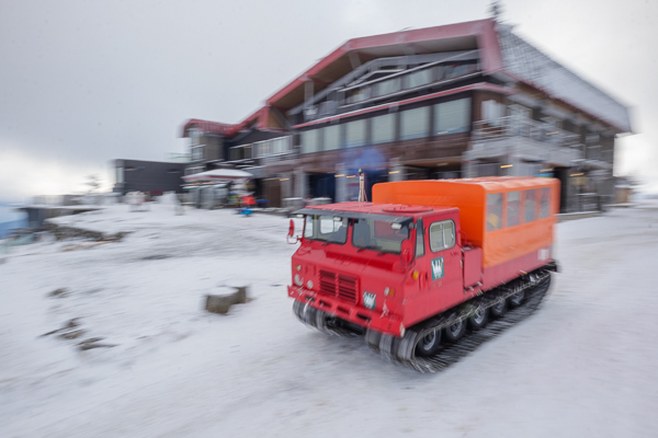 真っ白な雪原に、雪上車の真っ赤なボディーがよく映えます。