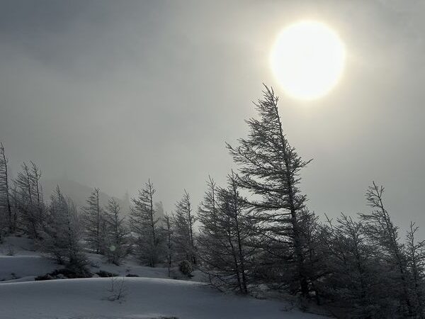 カラマツに霧氷が付いていました。太陽も出てきそうです。