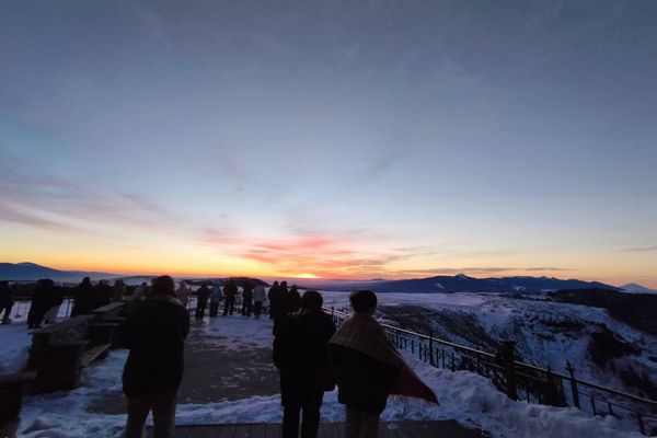 正面玄関テラスにて、たくさんのお客様が朝焼けと富士山付近にある遠い雲海を楽しまれておりました。