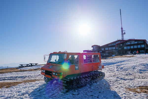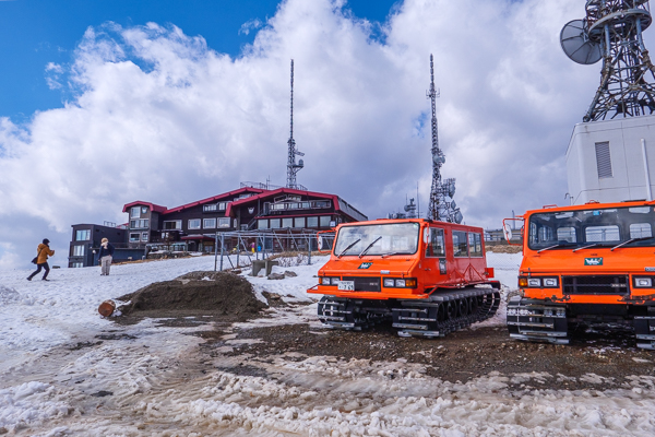 11時18分、ホテル前より高原を100mほど下り、テレビ信州の電波塔の下に勢ぞろいしていた雪上車。