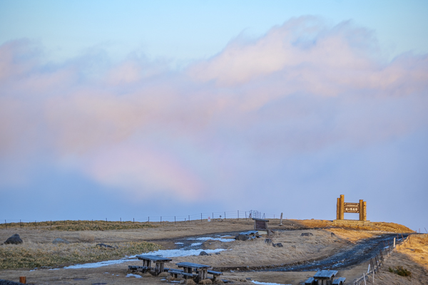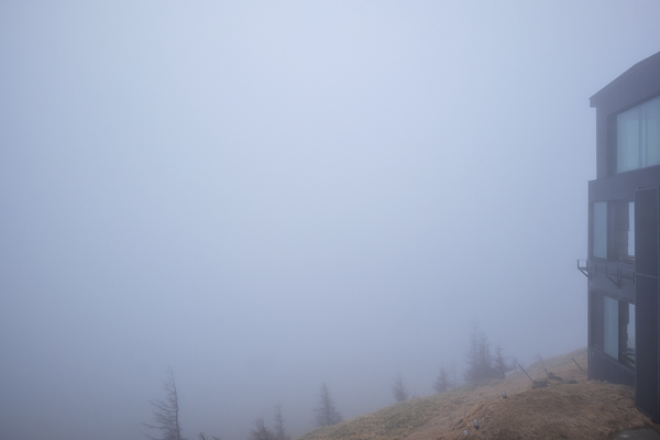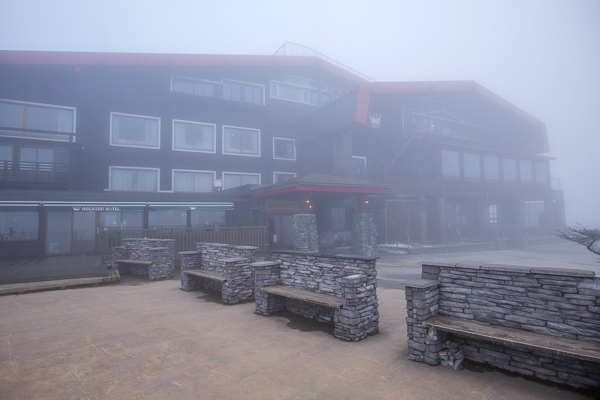 7時47分、日の出以降は再び真っ白な雲に中に入ってしまった王ヶ頭ホテル。