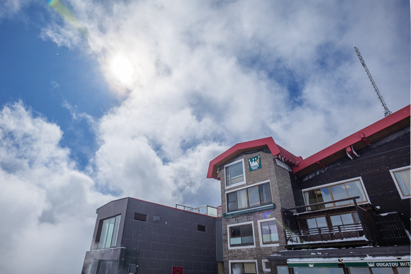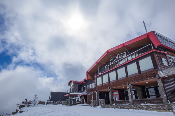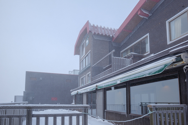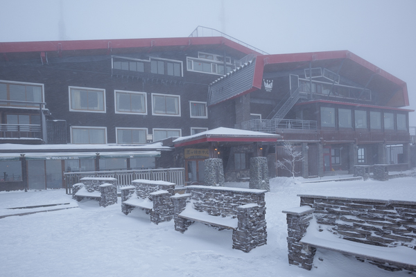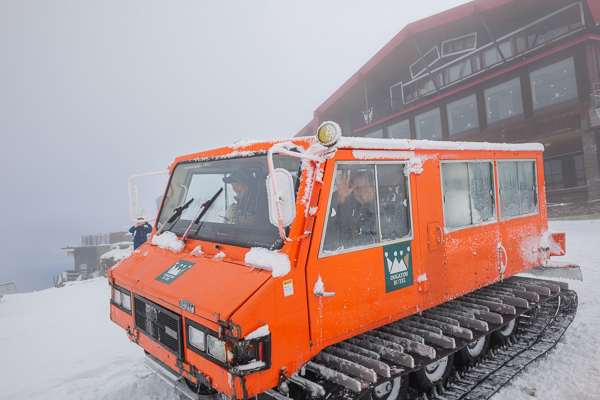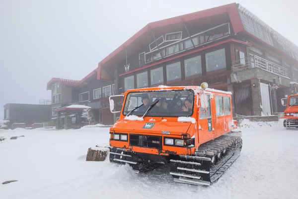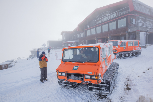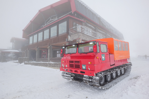 雪の積もったホテル前と、真っ赤なボディーの大型雪上車。