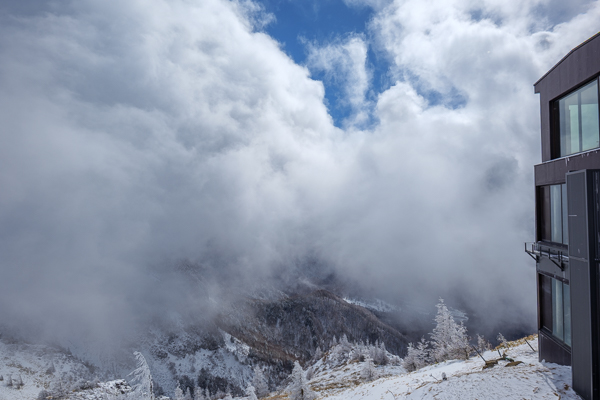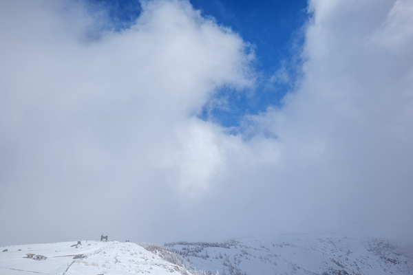 雲間に南側の山肌が垣間見えますが、意外と雪が付いていません。