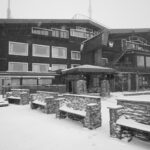 雪の積もったホテル前と、真っ赤なボディーの大型雪上車。