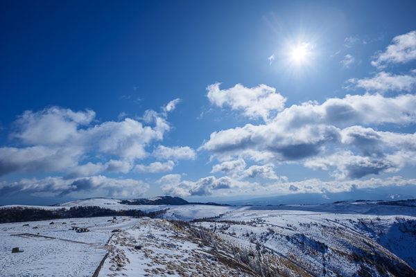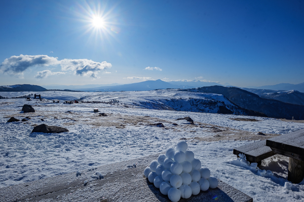 「雪見団子と朝日が昇る高原」
