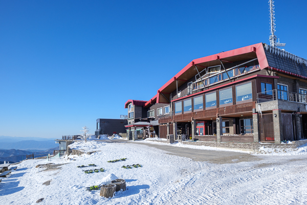 7時42分、積み上げた雪山の上より、王ヶ頭ホテル全景。