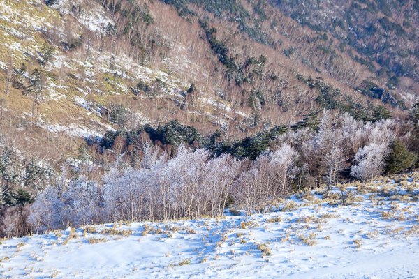今朝はしっかり冷え込みましたので、樹々には薄っすらと樹氷が付いていました。