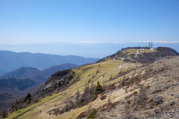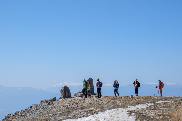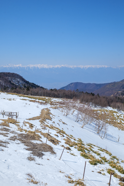 雪が残る天狗の露地と、霞みながらも姿を見せる北アルプス。