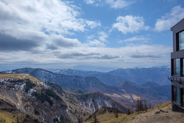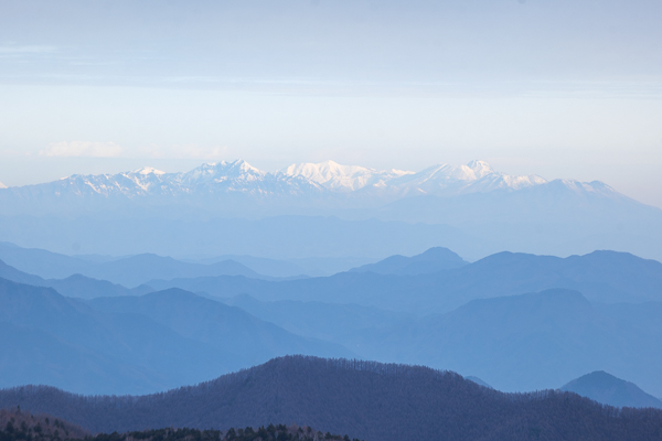7時44分、北側の広場から眺めた白馬方面の山々。