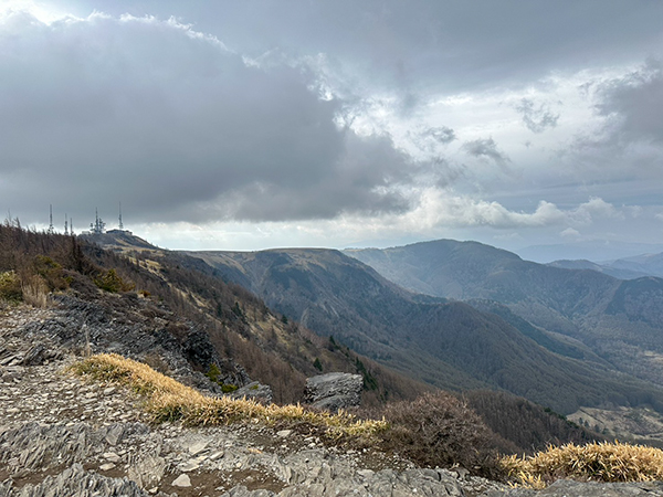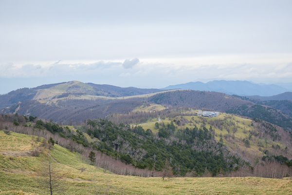 12時35分、北側の広場から、美ヶ原スカイラインと自然保護センター。